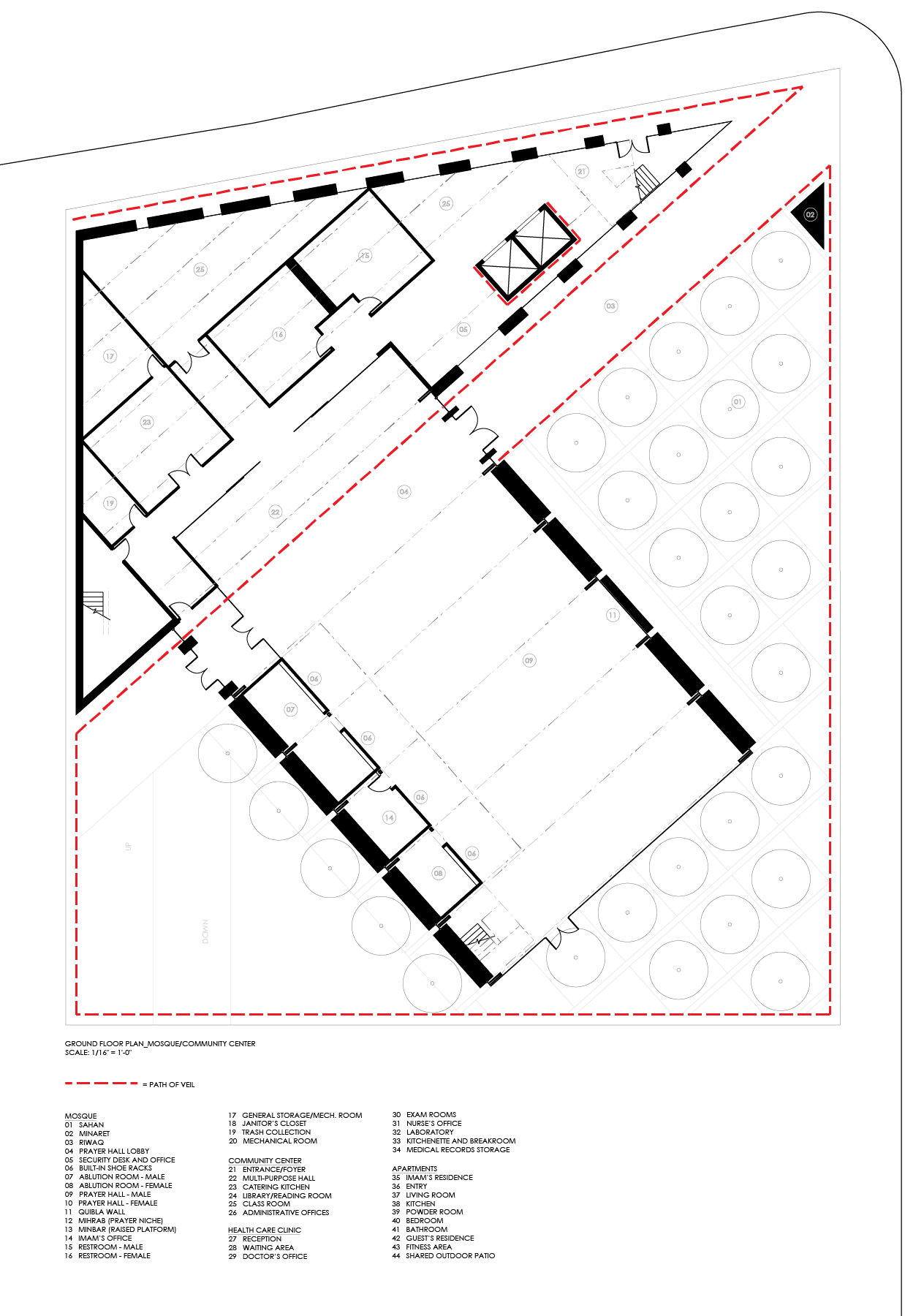The heart of a community, trying to protect values they hold dear while striving to embrace the outside world; the juxtaposition of privacy and transparency. Mosques in the region not only serve the community in social and religious affairs, but they also act as hubs for education and medical care. To cater to these broad programmatic needs, I designed a veil that envelops the building and public space that undulates to grant access to the garden or entryways, while cloaking private moments. The veil itself is composed of a hexagonal array with a single traditional Islamic pattern within. The pattern scales to grant visibility or to blur and distort, doing so in relation to the program.